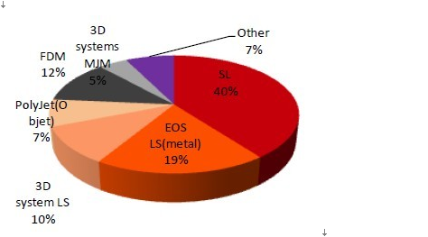根據WohlersAssociates在2011-2012年的調查顯示:現階段,下游打印服務商安裝最多的是基于立體平板印刷(SL)技術的3D打印設備,占比高達40%。作為最早成形的3D打印技術,占據較高的市場份額在情理之中。同時,技術發展相對較晚,以金屬為材料的激光打印設備,占比已經接近20%。如圖50所示。